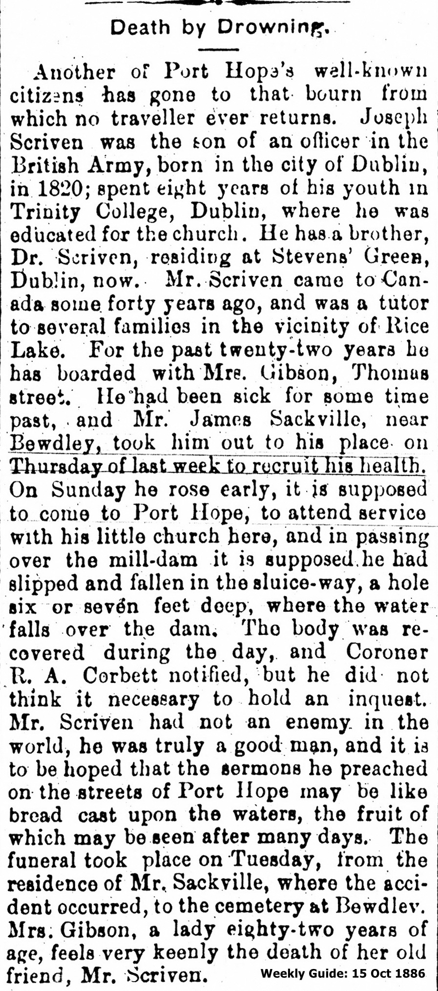 | Anderson | James | 28 Feb 1886 | Port Hope | 31 | Weekly Guide | 05 Mar 1886 | 04/05 | Jeweller. Buried Oshawa. Funeral item 8/1. |
