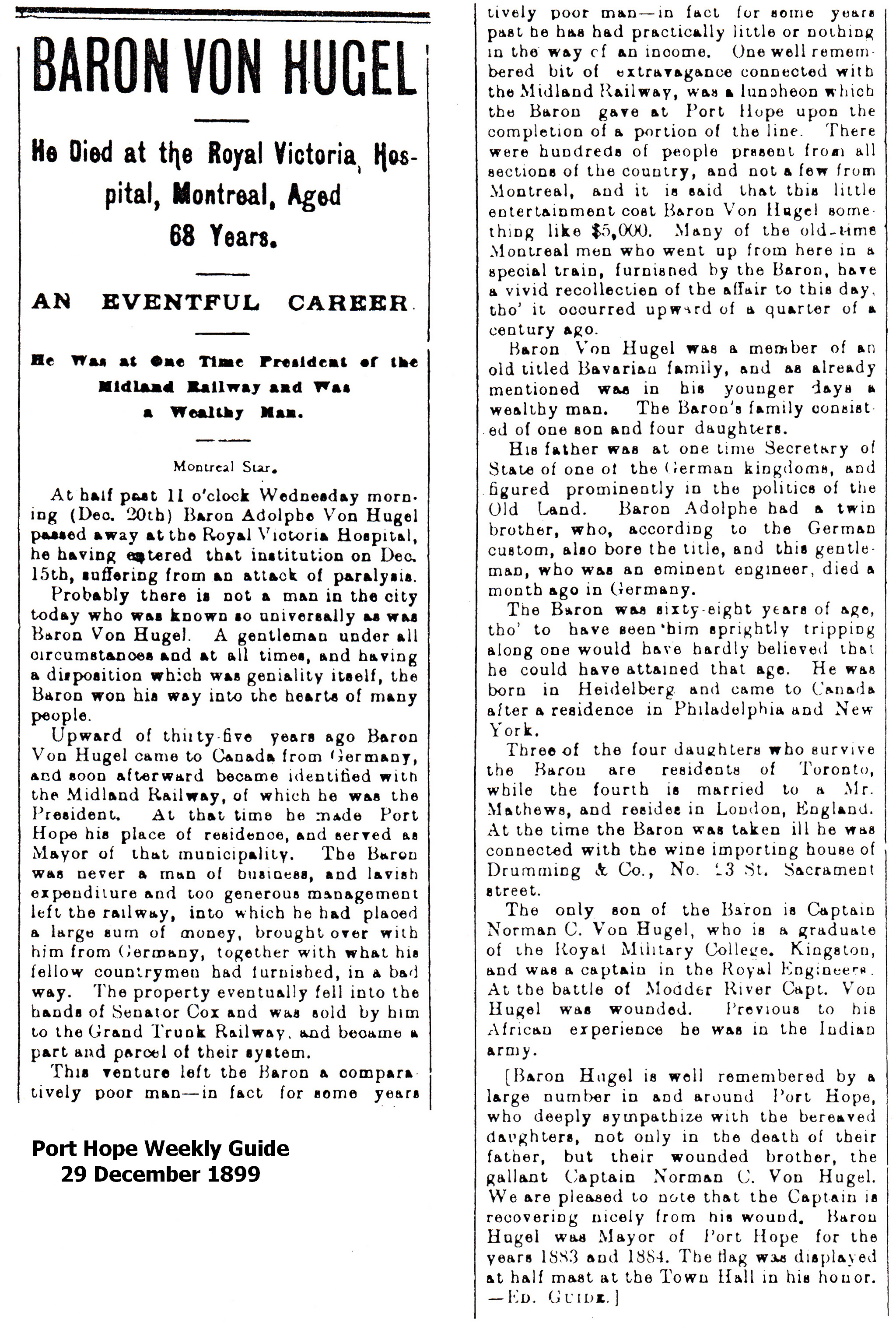 (1831:Heidelberg, Germany-20 Dec 1899:Royal Victoria Hospital, Montreal) came to Canada c1864 as a wealthy man of a titled family, via Philadelphia and New York c1865, and soon afterward became identified as President of the Midland Railway, which connected at Port Hope with the Grand Trunk Railway. He made arrangements with bondholders in Europe for money to advance the improvement of the roadbed. He appears to have been a less-than-successful businessman, his lavish expenditures and too-generous management resulting in the railway being taken over by the Grand Trunk Railway. As a result, he spent his latter years in relative poverty. The Weekly Times published a lengthy obituary.