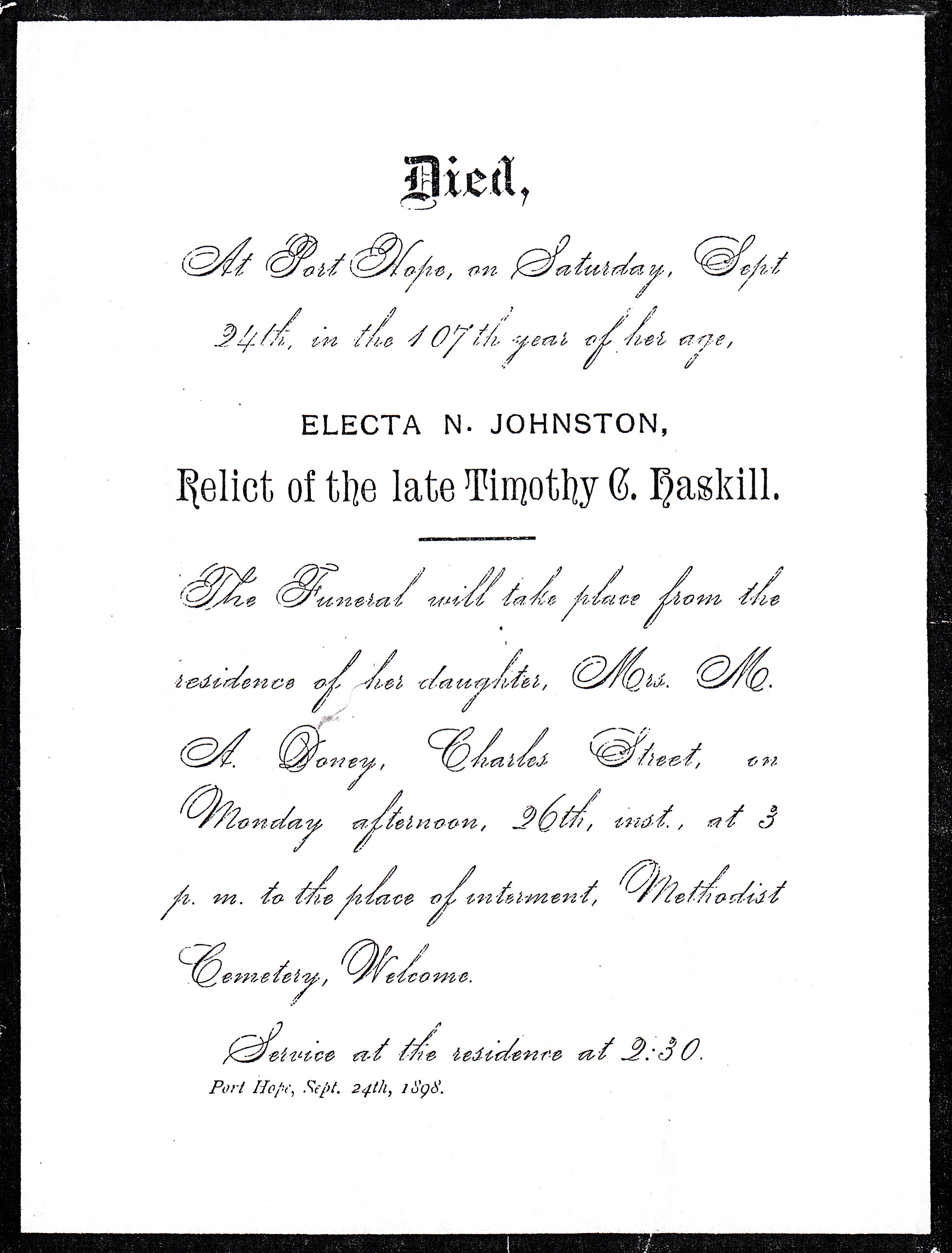 | Haskill | Electa N.(nee Johnston) | 106 | Relict of Timothy C. Haskill | 24 Sep 1898 | Port Hope | Union Cemetery | From Helen Anne Haskill (nee Walter) |